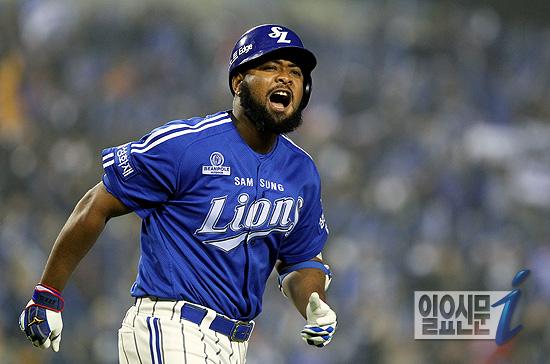 [일요신문] 11일 오후 서울 잠실구장에서 열린 2014 프로야구 넥센 히어로즈와 삼성 라이온즈의 한국시리즈 6차전에서 삼성 나바로가 6회초 무사 1,2루 때 비거리 125미터 좌중월 스리런홈런을 치고 홈인하며 세레모니를 펼치고 있다.(사진출처=삼성 라이온즈)