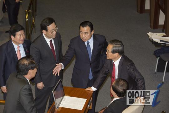 [일요신문] 국회 선진화법에 따른 예산안 처리 마지막 시한인 2일 밤, 2015년 예산안 처리를 위한 국회 본회의에 참석한 새누리당 이완구 원내대표, 주호영 정책위의장이 새정치민주연합의 지도부인 문희상 비대위원장과 우윤근 원내대표를 찾아 법안통과에 협조를 구하고 있다.
