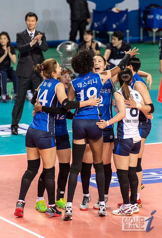 [일요신문] 6일 오후 경기도 화성 체육관에서 열린 NH농협 2014-2015시즌 V-리그 IBK기업은행 대 한국도로공사의 경기에서 IBK기업은행이 세트 스코어 3-0(25-23 25-17 25-13)으로 승리 후 동료들과 기쁨을 나누고 있다. / 최준필 기자 choijp85@ilyo.co.kr