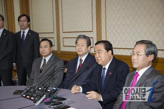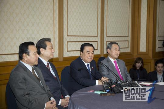 [일요신문] 10일 오후 국회 귀빈식당에서 새누리당 이완구 원내대표(왼쪽부터)·김무성 대표, 새정치민주연합 문희상 비대위원장·우윤근 원내대표가 정국현안을 풀기 위한 2+2여야 대표회담에서 문희상 새정치민주연합 비상대책위원장이 발언을 하고 있다.