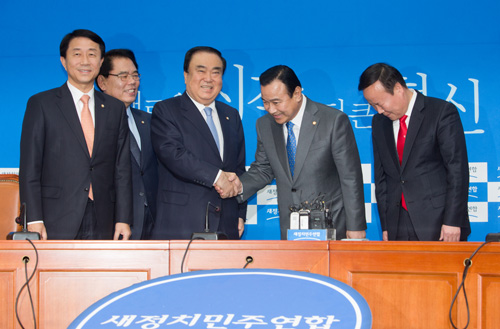 [일요신문] 국무총리로 내정된 이완구 새누리당 원내대표가 23일 오후 국회 새정치민주연합 당대표실을 찾아 문희상대표와 야당 지도부의원들과 인사를 나누고 있다.