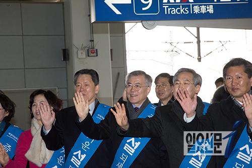 [일요신문] 17일 오전 서울 용산역에서 새정치민주연합의 문재인 대표를 비롯한 최고위원들과 당직자들이 구정을 맞아 고향으로 돌아가는 귀성객들에게 인사를 하고 즐거운 명절이 되길 소원하고 있다. 문재인 대표가 최고위원들과 함께 손을 흔들며 인사하고 있다.