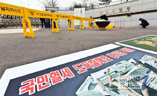 [일요신문] 애국국민운동대연합 소속 회원들이 17일 오후 서울 용산구 방위사업청 앞에서 기자회견을 열고 방위사업 비리 규탄 및 군납비리 척결을 촉구하는 퍼포먼스를 펼치고 있다. / 최준필 기자 choijp85@ilyo.co.kr