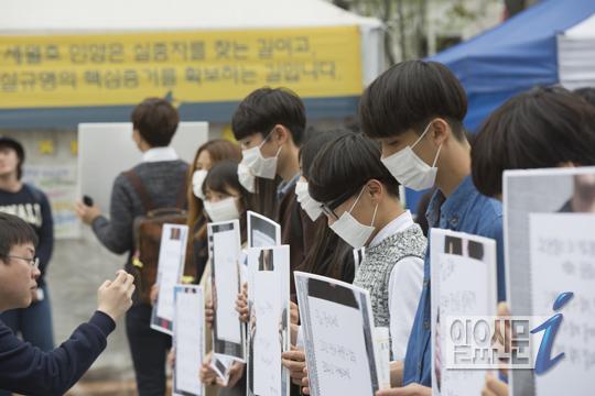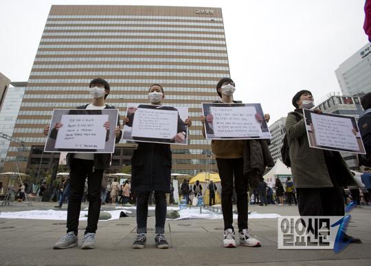 [일요신문] 12일 오후 광화문광장에서 그동안 언론에 노출되는 것을 극도로 꺼려왔던 세월호 희생자중 단원고 학생들의 형제, 자매들이 국민들에게, 혹은 희생자들에게 쓴 편지를 가족과 시민들이 들고 보여주고 있다.