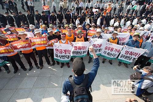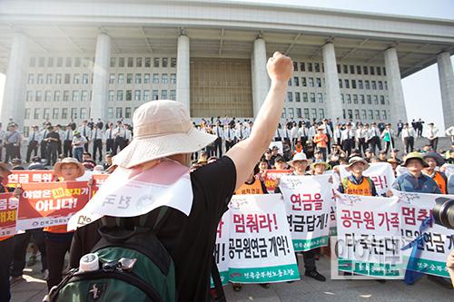 [일요신문] 여야가 합의한 공무원연금개혁 최종 협상시한을 하루 앞둔 1일 오후 전국공무원노조(전공노) 소속 노조원들이 서울 여의도 국회 본관 앞에서 기습시위를 벌이고 있다. 전국공무원노조는 "공무원들의 희생만 강요하는 공무원연금개혁에 반대한다"며, "연금개악 결사반대" "연금을 연금답게"를 구호로 외치고 있다.
