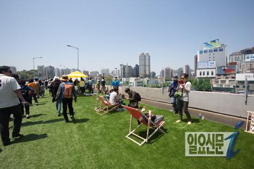 [일요신문] 서울시는 작년에 이어 서울역 앞 고가에 잔디를 깔고 10일 오전 11시 부터 오후 3시까지 시민들에게 고가를 개방하였다. 시민들이 잔디와 도심속 공원에서의 썬탠을 즐기고 있다.