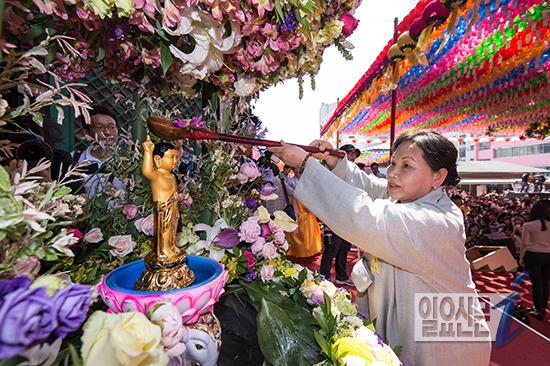 [일요신문] 불기 2559년 부처님오신날인 25일 오전 서울 종로구 조계사를 찾은 불교신자가 관불의식을 하고 있다. / 최준필 기자 choijp85@ilyo.co.kr