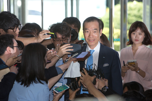 [일요신문] 엘리엇의 법률대리인 최영익 넥서스 대표변호사가 17일 서울 양재동 aT센터에서 열린 삼성물산 임시 주주총회 이후 취재진의 질문을 받으며 주총장을 나서고 있다.