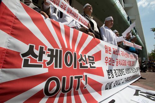 [일요신문] 박근혜 대통령을 비하하는 내용의 칼럼을 실은 일본 산케이신문의 서울지사 앞에서 4일 오후 애국국민운동대연합 회원들이 해당 칼럼의 삭제와 공식 사과를 요구하는 기자회견을하고 있다.