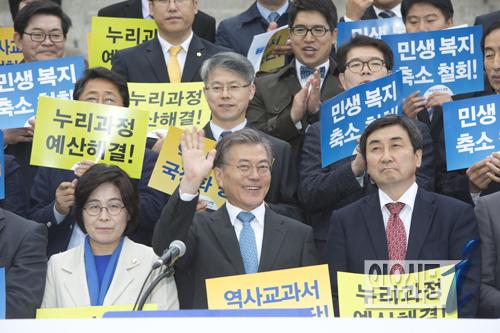 [일요신문] 9일 오전 국회 본청 앞 계단에서 열린 새정치민주연합의 역사교과서 국정화 및 민생복지 축소 저지 결의대회에 문재인 대표가 참석했다.
