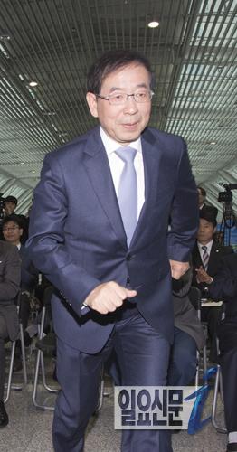 [일요신문] 9일 오후 지방자치 정책전당대회 정책토크콘서트에 참석한 박원순 서울시장이 기조연설을 하러 단상으로 달려나가고 있다..