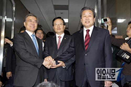 [일요신문] 9일 오후 국회의장실에서 비공개로 정의화 국회의장, 김무성 새누리당 대표, 문재인 새정치민주연합 대표가 만나는 3자 회동을 마치고 문재인, 정의화, 김무성 대표가 기자들에게 간단히 내용을 밝힌뒤 악수하고 있다.