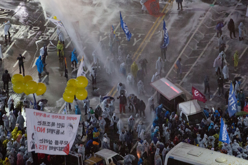 [일요신문] 14일 오후 서울 광화문네거리에서 열린 민중총궐기 투쟁대회에서 경찰차벽에 막힌 참가자들에게 경찰이 캡사이신을 섞은 물대포를 쏘고 있다.