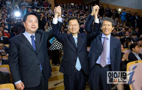 지지자들과 함께 손을 잡고 기념촬영을 하고 있다. 사진/임준선기자