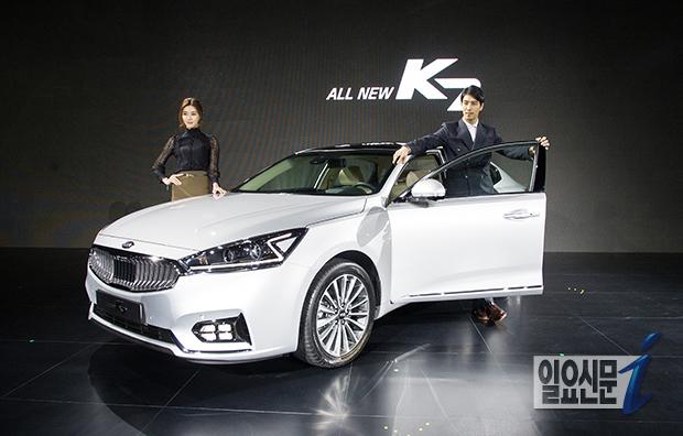 [일요신문] 26일 오전 서울 강남구 그랜드 인터컨티넨탈 서울 파르나스 호텔에서 열린 기아차 '올 뉴 K7 신차발표회'에서 모델들이 포즈를 취하고 있다. 올 뉴 K7은 외관 디자인에 변화를 줬다. 알파벳 'Z' 형상으로 빛나는 LED(발광다이오드) 주간주행등은 주·야간 주행 시 모두 점등된다. 또한 운전석 통풍시트, 전자식 파킹 브레이크, 버튼시동 스마트키, 스마트 트렁크 등 다양한 편의사양을 적용해 상품 경쟁력을 높였다는 게 회사측 설명이다.