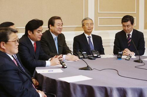 [일요신문] 김무성 새누리당 대표와 김종인 더불어민주당 비대위 대표를 비롯한 여야 지도부가 18일 저녁 서울 여의도 국회 귀빈식당에서 쟁점법안 처리·선거구획정을 위한 여야 4+4 회동을 열어 환담을 나누고 있다.