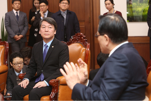 [일요신문] 국민의당 안철수 공동대표가 19일 오후 선거구 확정과 관련 정의화 국회의장실을 방문해 정 의장과 이야기를 나누고 있다.