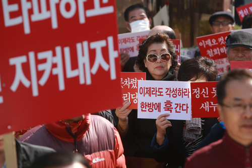 [일요신문] 20대 총선 공천 심사에서 탈락한 새누리당 이재오 의원의 지지자들이 16일 서울 여의도 당사 앞에서 컷오프 철회를 요구하며 집회를 하고 있다.