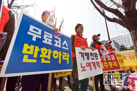 전국 각지에서 모인 조합원들은 "골프존은 부당한 코스사용료 착취와 무차별 시스템 판매에 따른 시장과포화로 업주들의 생존권마저 위협하고 있다"고 주장했다. / 최준필 기자 choijp85@ilyo.co.kr