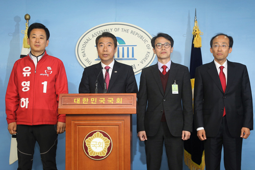 [일요신문] 새누리당 김무성 대표가 무공천을 선언한 지역구 후보들이 25일 오전 서울 여의도 국회 정론관에서 "김 대표의 행동은 부적법하다"며 기자회견을 하고 있다. 왼쪽부터 유영하(서울 송파구을), 정종섭(대구 동구갑), 유재길(서울 은평구을), 추경호(대구 달성) 예비후보.