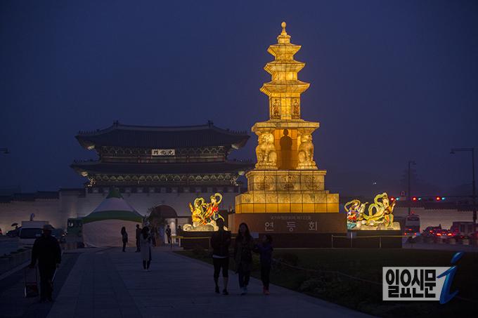 [일요신문] 22일 밤 시민들이 서울 광화문광장에 설치된 사사자삼층석탑을 구경하며 즐거운 시간을 보내고 있다. 사사자삼층석탑은 부처님 오신날을 기념하기 위해 설치되었으며 오는 5월 15일까지 불을 밝힌다. 고성준 기자